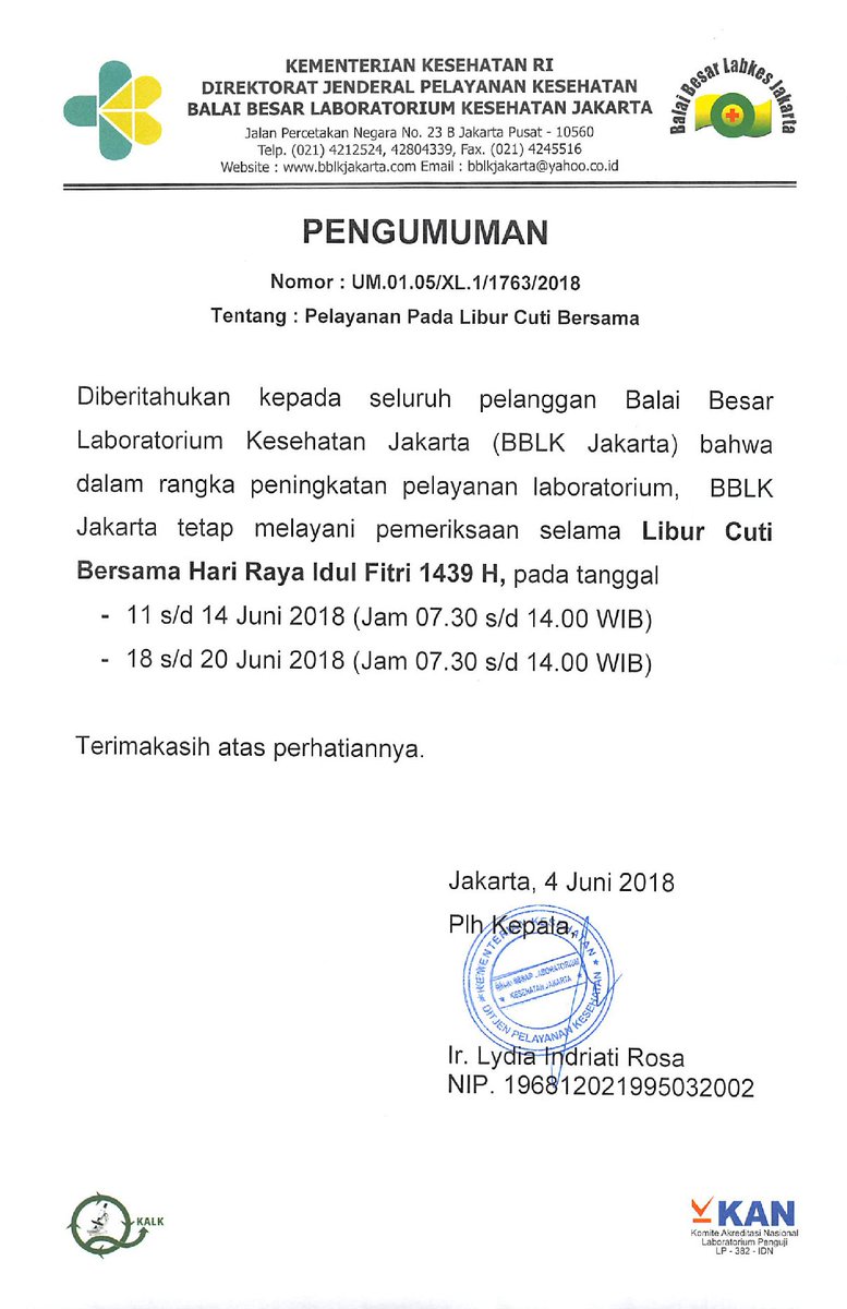Bblk jakarta laboratorium. Balai besar laboratorium kesehatan jakarta jakarta. Bblk jakarta adalah unit pelaksana teknis dibawah direktorat pelayanan kesehatan. Jakarta penandatanganan perjanjian kinerja tahun anggaran 2020 antara direktur jenderal pelayanan kesehatan dengan kepala balai besar laboratorium kesehatan jakarta selaku unit pelaksana teknis di lingkungan direktorat jenderal pelayanan kesehatan telah dilaksanakan di palembang tanggal 22 november 2019. Iht ini dilaksanakan sebagai upaya meningkatkan kompetensi sumber daya manusia bblk jakarta sebagai penyelenggara uji profisiensi pemantapan mutu eksternal pme sesuai kepmenkes ri nomor hk 02 02 menkes 400 2016 tahun 2016 tentang bblk jakarta sebagai penyelenggara nasional pemantapan mutu eksternal pnpme.