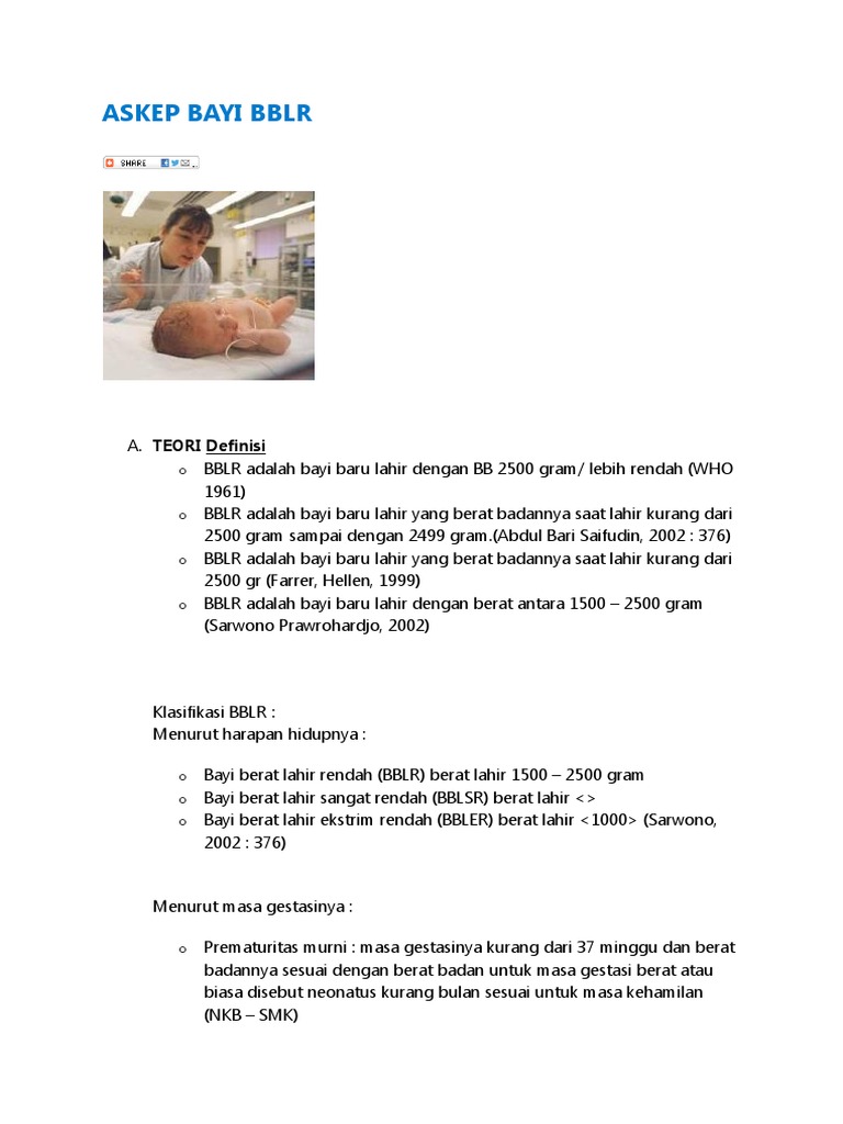 Bblr berkaitan dengan tingginya angka kematian bayi dan balita juga dapat berdampak serius pada kualitas generasi mendatang yaitu akan memperlambat pertumbuhan dan perkambangan anak serta berpengaruh pada penurunan kecerdasan. Asi air susu ibu merupakan pilihan pertama jika bayi mampu mengisap. Dari 2500 gram disebut low birth weight infants bblr berdasarkan pengertian di atas maka bayi dengan berat badan lahir rendah dapat dibagi menjadi 2 golongan.