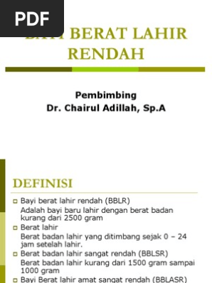 Berat badan lahir amat sangat rendah bblasr pada bayi. Bayi berat lahir rendah bblr adalah bayi dengan berat lahir antara 1500 gram sampai dengan 2500 gram. Bayi berat lahir amat sangat rendah bblasr adalah bayi dengan berat lahir kurang dari 1000 gram. Bblr berkaitan dengan tingginya angka kematian bayi dan balita juga dapat berdampak serius pada kualitas generasi mendatang yaitu akan memperlambat pertumbuhan dan perkambangan anak serta berpengaruh pada penurunan kecerdasan.