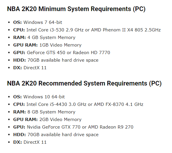 Nba 2k20 system requirements state that you will need at least 4 gb of ram. Pc nba 2k20 system requirements 2k adam created august 12 2019 18 58. Geforce gts 450 or radeon hd 7770. System requirements lab runs millions of pc requirements tests on over 6 000 games a month.
